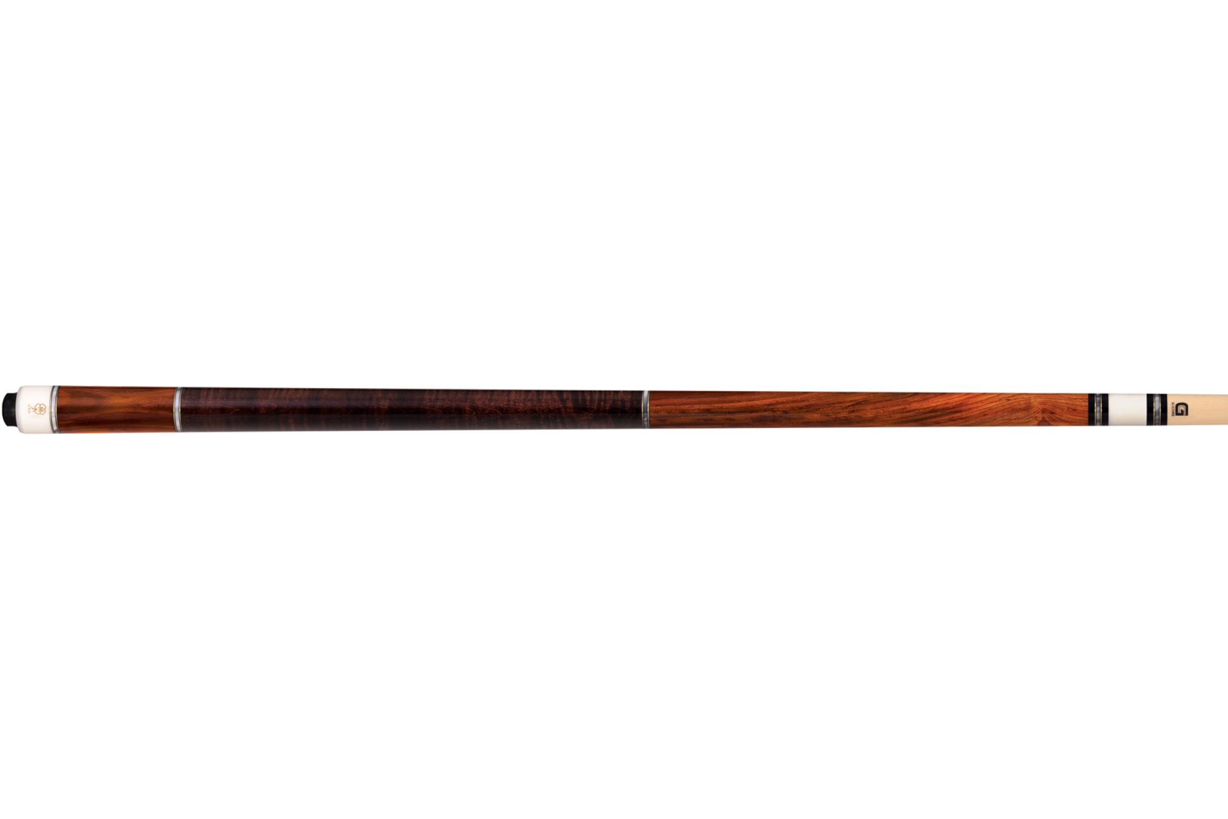 Cocobolo forearm/sleeve Custom Curly maple no-wrap handle with Dark English stain Custom brass and white pearl rings White urethane joint meer info